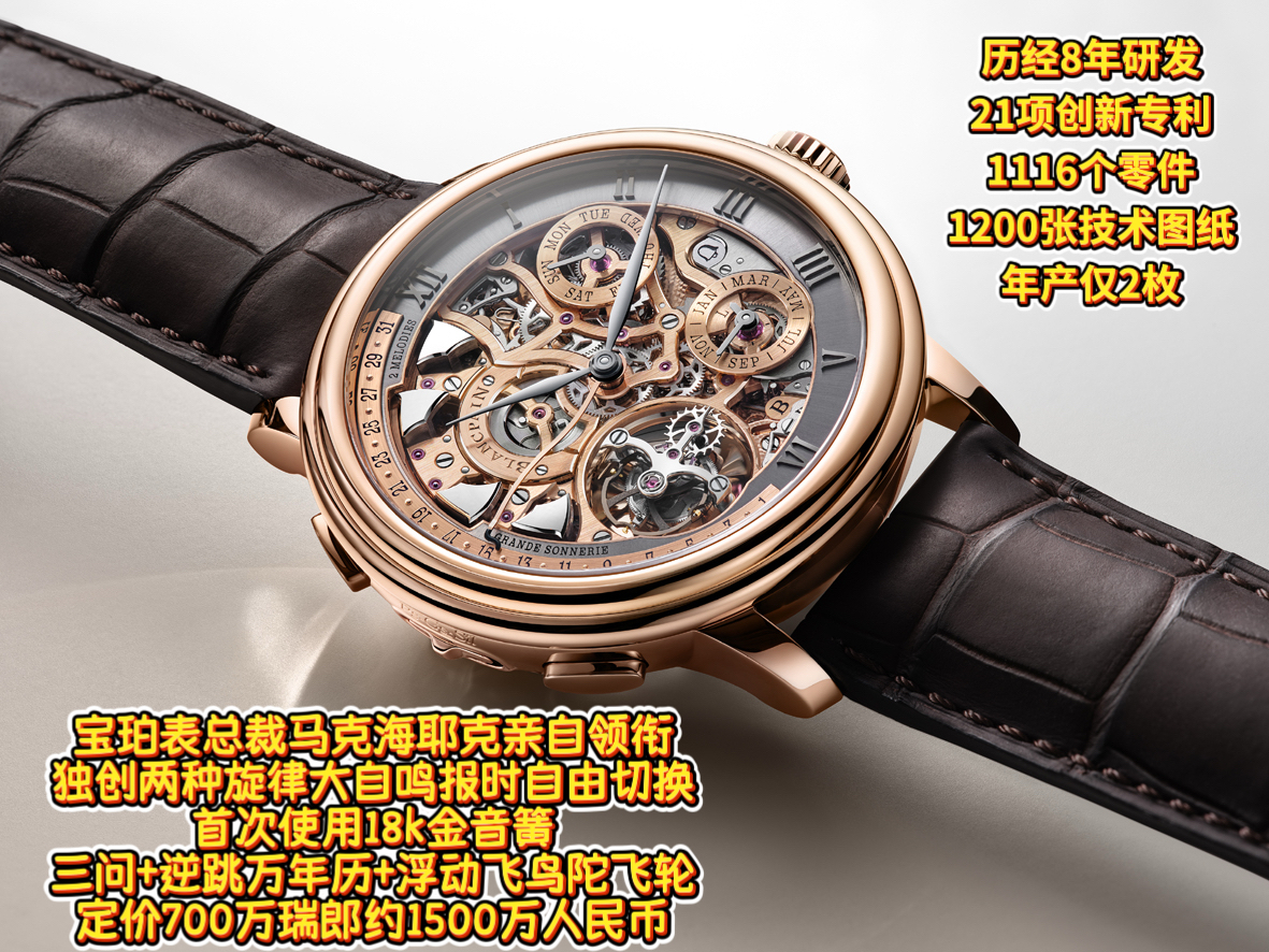 时值品牌290周年收尾之际,宝珀向世人推出震撼巨作:全球首款带有双旋律的四音四锤大小自鸣腕表----“大音乐家”(Grande Double Sonnerie)。