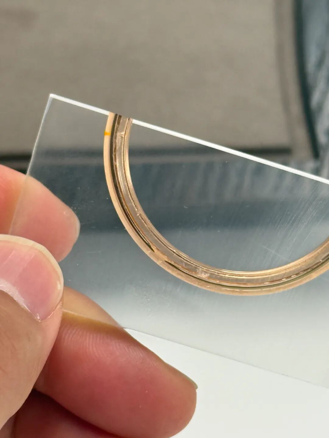 音量,是考核高级鸣音腕表是否优异的重要标准 。为了有效促进机芯声波向空气的高效传导,宝珀的腕表设计师们独创了一种嵌于表圈内部的金质声学振膜:一个坚固地附着在表镜上、并嵌入表圈下方的红金膜层。这个膜层可以接收来自机芯音簧的振动,并起到类似于扬声器的作用,将振动音簧的声音放大并扩散至表镜和表圈。通常,腕表的表镜和表圈会衰减低频声音,结果是:当高频声音占主导时,音色会带有一定程度的刺耳感。这项专利膜层解决了这个问题,它强调了理想的中低频声音,同时过滤掉不那么理想的高频。 这一增大鸣音表音量并平衡音频的膜片,也是 宝珀”大音乐家“(宝珀15GSQ)腕表 机芯13项品牌专利技术之一 。