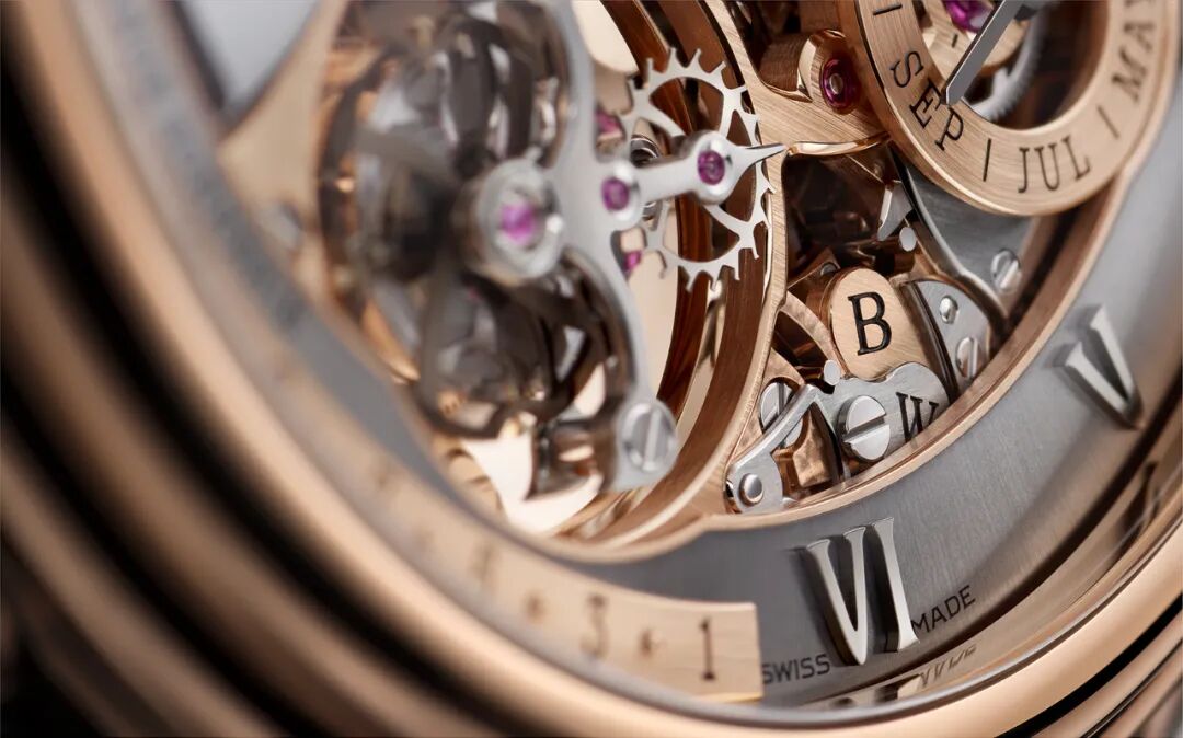 ▲ “大音乐家”除了四音四锤大小自鸣,还集合了三问、 宝珀标志性浮动式飞鸟陀飞轮和 逆跳万年历三大复杂功能